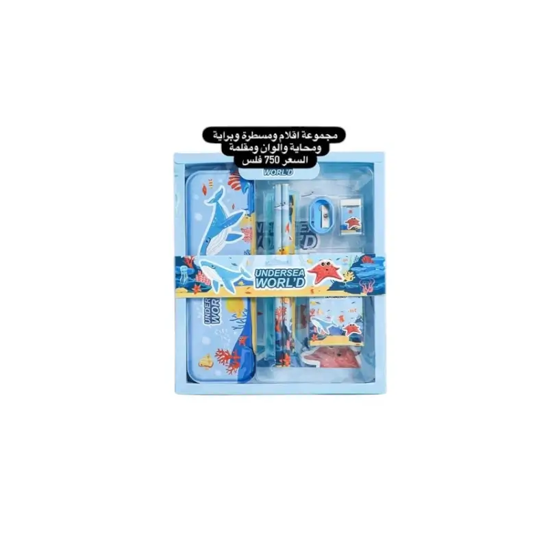 مجموعة أقلام ومسطرة وبراية ومحاية والوان ومقلمة