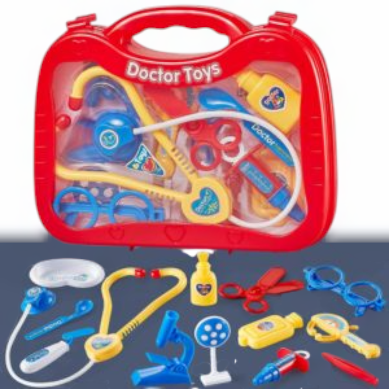 🧰 محتويات الحقيبة: سماعة طبيب مقياس حرارة حقنة بلاستيكية مطرقة فحص الأعصاب ميزان ضغط (بعضها يصدر أصواتًا) مقص وملقط بلاستيكي مرآة للفم أو أداة فحص الأذن